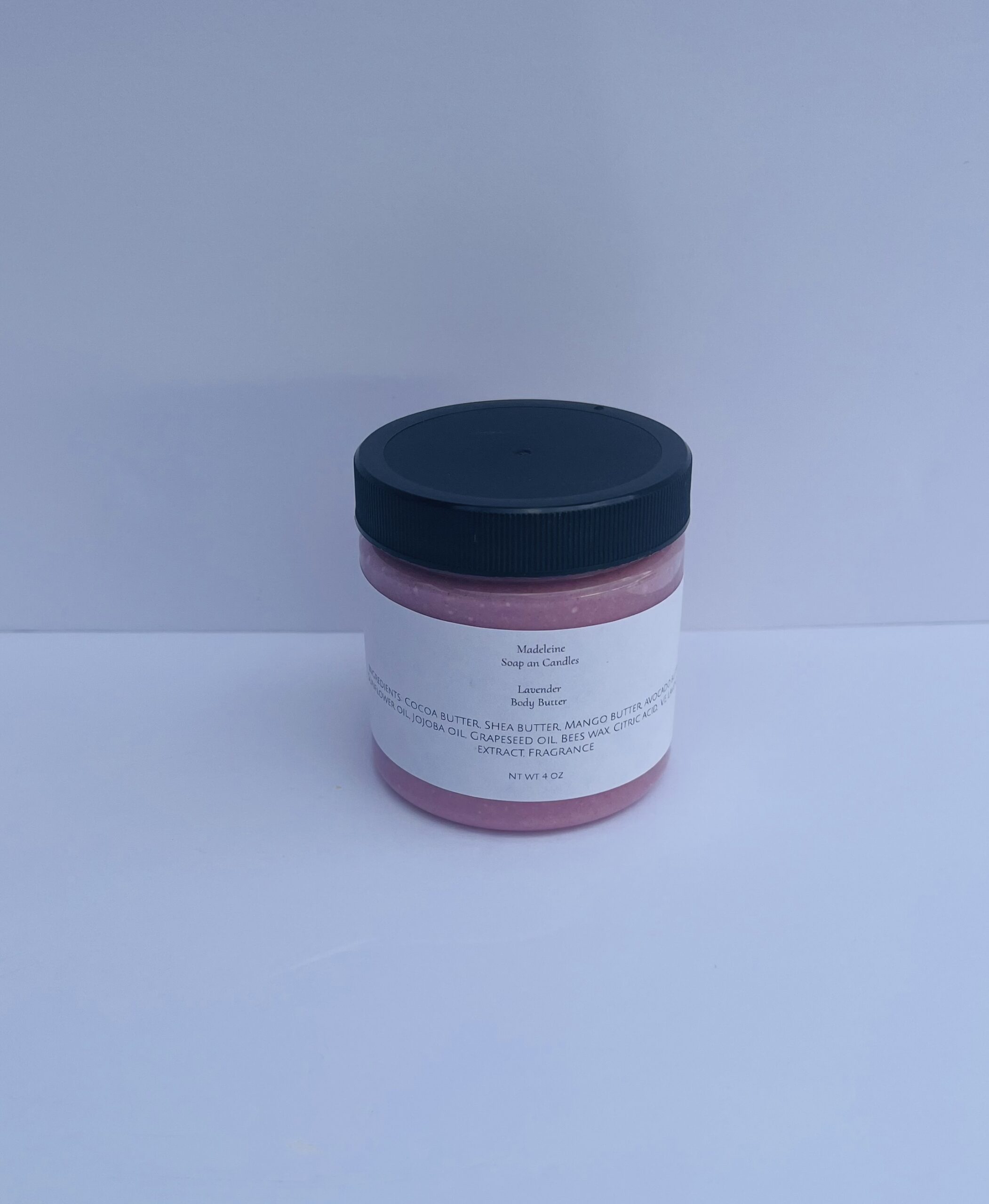 Ingredients: Cocoa butter, Shea butter, Mango butter, Avocado butter, Sunflower oil, Jojoba oil, Grapeseed oil, Bees wax, Citric acid, V.E, Lavender extract, Fragrance.
